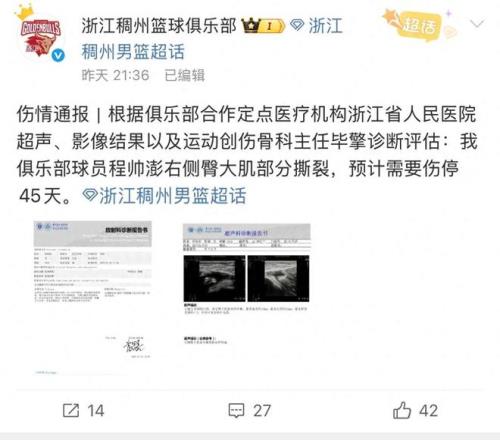 浙江男籃官方發(fā)文,程帥澎右側(cè)臀大肌部分撕裂,預(yù)計需要傷停45天。