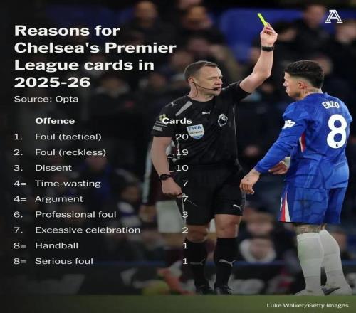切爾西本賽季英超吃牌原因排行:戰術犯規20張,表達異議10張 懂球帝 2026-02-26 19:15:24 在上輪英超對陣伯恩利的比賽中,切爾西再次有球員吃到紅牌,最終藍軍也痛失三分。賽季至今,切爾西已經在英超吃到了62張黃牌和6張紅牌,TA則統計了切爾西62張黃牌和6張紅牌的吃牌原因。切爾西本賽季英超吃牌原因排行1、戰術犯規 20張2、魯莽犯規 19張3、表達異議 10張4、拖延時間 7張4、爭辯 7張6、故意犯規 3張7、過度慶祝 2張8、手球 1張8、嚴重犯規 1張注:TA列出各項原因吃牌數的統計之和為70張牌,之所以與62黃+6紅的總數68張不同,是由于TA將兩黃變一紅情況下的每張黃牌單獨統計原因了。【上咪咕獨家看英超】英超免費觀看_紅牌免費觀看_吃牌免費觀看_英超高清在線_紅牌高清在線_吃牌高清在線 英超 紅牌 吃牌 伯恩利 切爾西隊 戰術犯規 上一篇: 曼聯敲定夏窗離隊第1人!身價500萬歐,拉爵爺低價兜售奧納納 下一篇: 《體育報》:巴薩正密切關注伯恩茅斯中衛塞內西