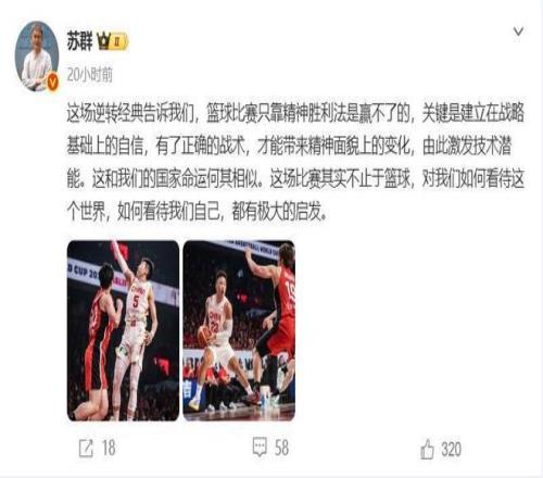 這場比賽的三名裁判分別來自新西蘭、泰國和新加坡,其中兩名我們還非常的熟悉,他們從下半場開始發力,最后2分鐘時間里的判罰更加的離譜,但那又怎樣?中國隊有著絕對的實力和必勝的決心,即便是客場5打8依舊可以拿下比賽。蘇群老師點評這場比賽時候說到“籃球比賽只靠精神勝利法是贏不了的,關鍵是建立在戰略基礎上的自信,有了正確的戰術,才能帶來精神面貌上的變化,由此激發技術潛能。”