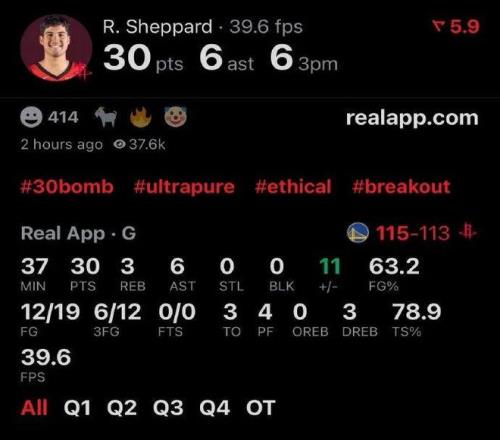 他替補出戰37分鐘,雖然防守被打爆,進攻也打爆了勇士,投籃19中12,三分12中6,火力全開,射下了全隊最高的30分,還有3籃板6助攻。