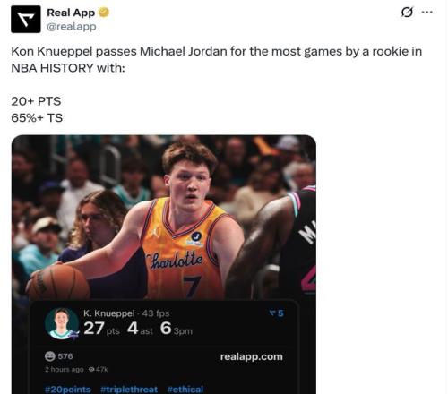 憑借這樣的表現,克努佩爾本賽季已經27次單場交出至少20+得分且真實命中率至少為65%,打破喬丹1984-85賽季保持的NBA歷史新秀紀錄,而黃蜂本賽季還有18場常規賽要打,按照克努佩爾的狀態,他勢必將大幅提升這一紀錄。