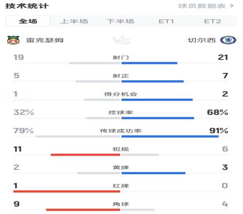 雷克瑟姆24切爾西全場數據:射門1921,射正57,控球率32%68% 直播吧 2026-03-08 07:08:37 體育播報3月8日宣 足總杯1/8決賽,雷克瑟姆主場加時2-4不敵切爾西。全場比賽數據如下:射門19-21射正5-7進球機會1-2控球率32%-68%傳球成功率79%-91%犯規11-6黃牌2-3紅牌1-0角球9-4足球免費觀看_切爾西免費觀看_英超免費觀看_足球高清在線_切爾西高清在線_英超高清在線 足球 切爾西 英超 上一篇: 徹底殺死比賽!若昂佩德羅破門,切爾西加時42領先 下一篇: 晉級8強!切爾西42十人雷克瑟姆加納喬加時破門+造烏龍+造紅牌