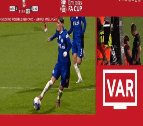 第92分鐘,加納喬左路突破,多布森飛鏟對方小腿,裁判回看VAR判罰直紅,雷克瑟姆剩下10人作戰。