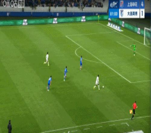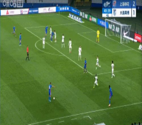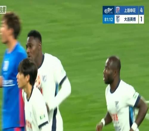 第45+4分鐘,馬馬杜防地高空球冒頂,拉唐一腳推射再下一城,申花3-1領先大連英博!