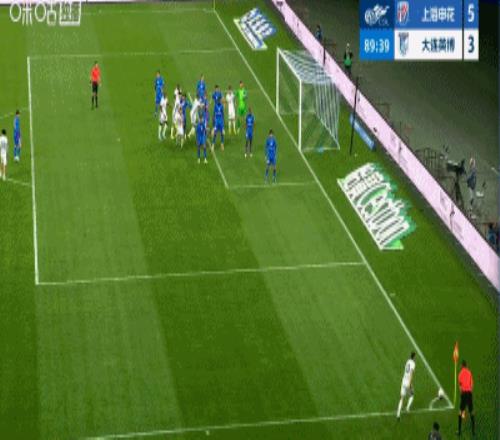 第90分鐘,英博右側角球進攻,馮勁門前打空門得分,大連英博3-5!