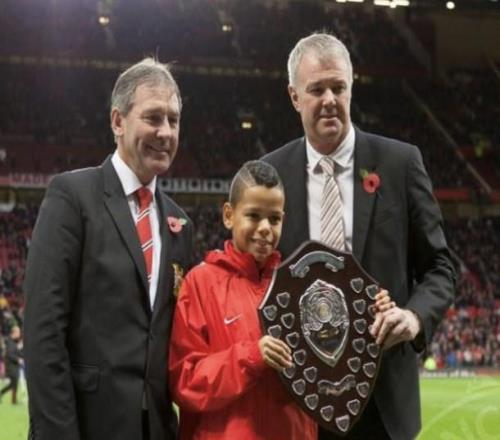 帖子里有一張照片:一個穿著亮紅色外套的11歲男孩,在老特拉福德球場的草坪上,從俱樂部傳奇布萊恩-羅布森和加里-帕里斯特手中接過冠軍獎杯。那場頒獎是在曼聯對陣水晶宮的英超比賽之前進行的。