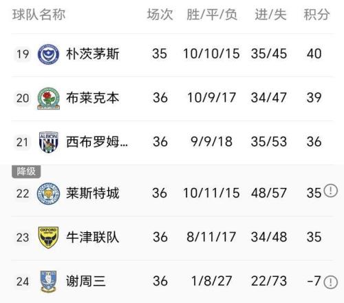 此戰(zhàn)過后,萊斯特城遭遇10輪不勝,36輪比賽10勝11平15負(fù),僅積35分位列英冠第22,也就是聯(lián)賽倒數(shù)第3!