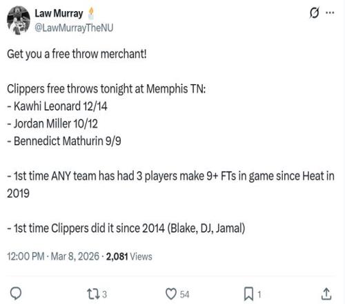同時快船隊全場3人至少獲得9次罰球,也成為19年以來聯盟首隊,更是14年來快船隊首次,上次還要追溯到格里芬、小喬丹和克勞福德時期。