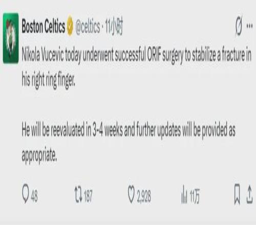 北京時間3月8日,凱爾特人官方宣布:球隊中鋒武切維奇今日成功接受右手無名指骨折的切開復位內(nèi)固定術(ORIF),將在3-4周后進行復查。常規(guī)賽將在4月中旬結(jié)束,還有5周的時間,凱爾特人希望武切維奇能在收官階段復出。