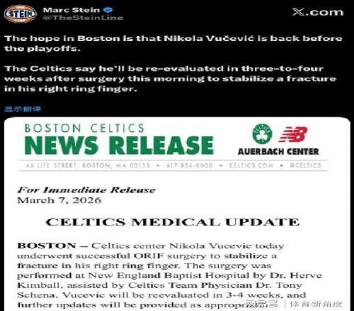 在剛剛宣告回歸賽場(chǎng)之際,凱爾特人隊(duì)卻傳來(lái)另一則令人揪心的消息:球隊(duì)核心球員武切維奇不幸遭遇無(wú)名指骨折,已接受手術(shù)治療,預(yù)計(jì)將在3至4周后接受復(fù)查以確定恢復(fù)情況。據(jù)知名記者Stein透露,凱爾特人方面寄望武切維奇能在季后賽前重返賽場(chǎng),為球隊(duì)爭(zhēng)冠助力。