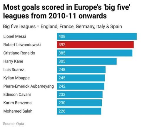 接下來是進球數(shù)據(jù)。自2010年以來,只有一名球員的進球數(shù)超過他:梅西。