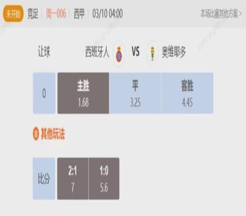目前競彩數據來看,給出對西班牙人主場的支持相當有力,對其還是頗有期待的,本場看西班牙人勝。