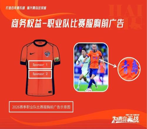 從青島海牛招商手冊發布的示例內容來看,他們還有進一步的招商計劃。比如,球隊冠名權還在積極推進招商中,如果有商家支持,青島海牛將以“青島海?!痢痢痢陵牎钡拿?,馳騁在2026賽季中超和足協杯賽場。又如,胸前和背后廣告,俱樂部各預留了兩處贊助商的商業展示區域。這也是一場比賽中,曝光率最高的兩大黃金位置。另外,訓練服以及賽前熱身服,以及青訓梯隊服裝,也設置有胸前和背后廣告招商計劃。