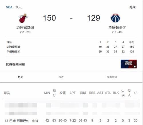 科比單場81分記錄被打破!熱火名宿單場暴砍83分 快科技 2026-03-11 17:51:37 近日,在剛剛結束的NBA常規賽熱火VS奇才的比賽中,熱火的球員阿德巴約在比賽中打出了統治級別表現,轟下了單場83分,這場比賽熱火以150-129取得勝利。值得一提的是,這個個人得分記錄打破了此前由NBA球星科比保持的歷史第二的單場得分記錄。歷史第一的得分記錄仍由張伯倫的單場100分保持。奇才免費觀看_首秀免費觀看_熱火隊免費觀看_奇才高清在線_首秀高清在線_熱火隊高清在線 奇才 首秀 熱火隊 nba球星 NBA常規賽 威爾特·張伯倫 科比·布萊恩特 上一篇: 別生氣了哈登...他竟然笑著跟登哥求和 下一篇: 東里狂轟62+18+19,湖人3連勝升第四!這點變化比7戰6勝更有價值