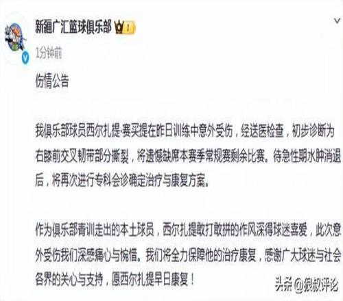 北京時間3月10日,根據新疆男籃官方社媒公示,我俱樂部球員西爾扎提·賽買提在昨日訓練中意外受傷,經送醫檢查,初步診斷為右膝前交叉韌帶部分撕裂,將遺憾缺席本賽季常規賽剩余比賽。