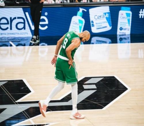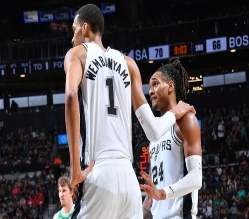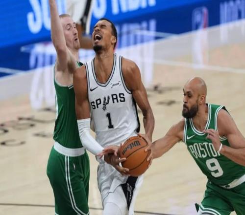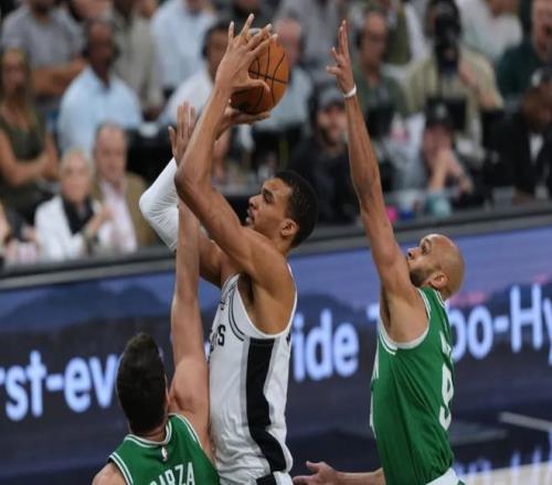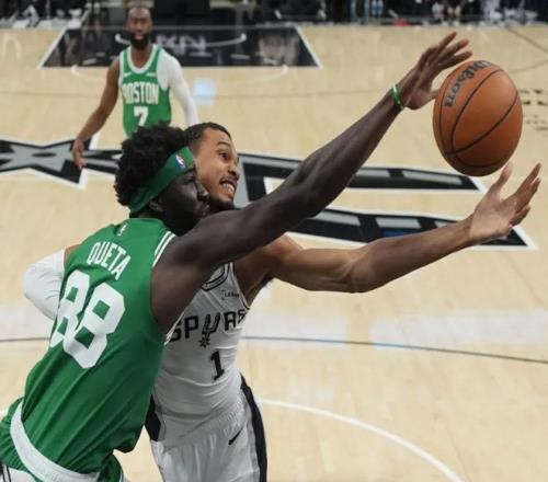 塔圖姆三分球穩住局面,文班亞馬立刻回應三分,聯合卡斯爾和??怂棺菲健0雸鰞申牬虺?8平!進入下半場,文班亞馬和瓦塞爾下三分雨,加上??怂沟耐饩€轟炸,綠軍有些頂不住了!不過懷特站出來連續軍訓文班亞馬,塔圖姆迎著文班亞馬滑翔上籃也中!中段懷特繼續點名文班亞馬,正面弧頂三分直接扔進,將馬刺打停。不過馬刺依靠約翰遜維持火力,文班亞馬三分球也準,馬刺保持微弱領先。三節打完時,馬刺97-90領先,懷特出現抽筋的情況。決戰第四節,塔圖姆帶隊一路追到只差3分。
