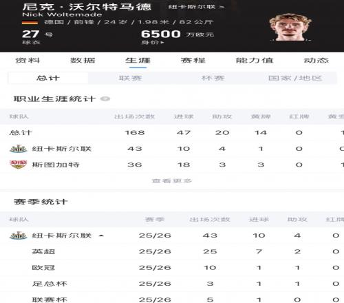 高開低走!24歲沃爾特馬德下半程18場僅進1球,紐卡7500萬歐引進 直播吧 2026-03-13 20:17:01 體育播報03月13日宣 歐冠1/8決賽首回合,紐卡1-1戰平巴薩,本場比賽沃爾特馬德枯坐板凳未能登場。24歲的沃爾特馬德去年夏天以7500萬歐的價格,從斯圖加特轉會至紐卡斯爾。在代表紐卡出戰的前12場比賽中,沃爾特馬德就打入了6粒進球。在本賽季上半程的比賽中,沃爾特馬德各項賽事出場25次貢獻9球,但進入下半程,沃爾特馬德的狀態有所下滑,出場時間變少,18場比賽僅打入1球。沃爾特馬德本賽季為紐卡出場43次,貢獻10球4助,他與球隊的合同至2031年,現身價6500萬歐。足球免費觀看_英超免費觀看_紐卡斯爾聯免費觀看_足球高清在線_英超高清在線_紐卡斯爾聯高清在線 足球 英超 紐卡斯爾聯 上一篇: 小吧譯言家英超歐冠集體翻車,究竟是錢白花了還是人累垮了 下一篇: 歐文:無法相信人們還在質疑卡里克是否應該轉正,他做得很好
