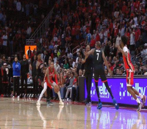 比賽最后30秒,火箭落后4分,先是小賈巴里·史密斯命中底角三分,緊接著鵜鶘暫停后穆雷接球運球踩線,直接將球權交還給火箭。