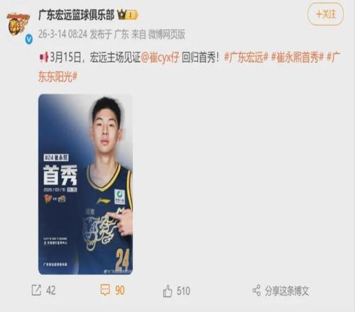 北京時(shí)間3月14日上午,廣東宏遠(yuǎn)官方宣布:崔永熙將在3月15日廣東主場(chǎng)對(duì)陣遼寧的比賽中復(fù)出。自從本賽季加盟廣東男籃,崔永熙還沒(méi)有出戰(zhàn)過(guò)。自2024年12月12日受傷之后,崔永熙休戰(zhàn)了1年零3個(gè)月,時(shí)隔458天重返賽場(chǎng)!