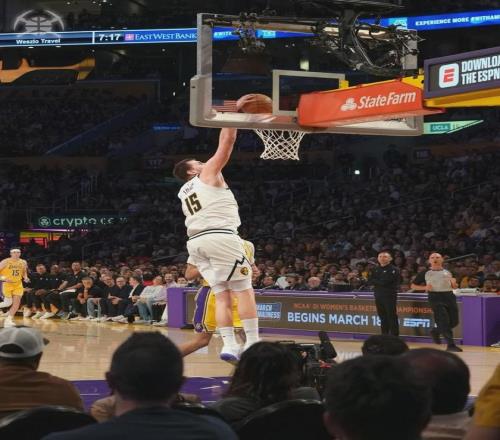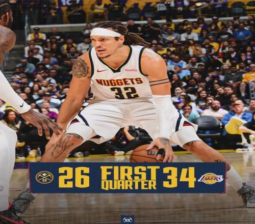 掘金棄用瓦蘭直接啟用小個陣容,穆雷上半場8中1僅得4分4失誤,湖人一度拉開到17分。眼看比賽要花,約基奇只能重新登場。第二節卡梅隆-約翰遜命中兩記三分,湖人也不敢一直夾擊約老師了。第二節后半段,掘金追到10分左右。