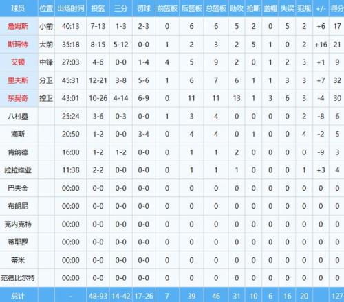 湖人四人得分上雙,東契奇30分11板13助3帽,里夫斯32分7板6助,詹姆斯17分6板5助2斷,斯瑪特扔進5記三分球轟下21分3板2助5斷。