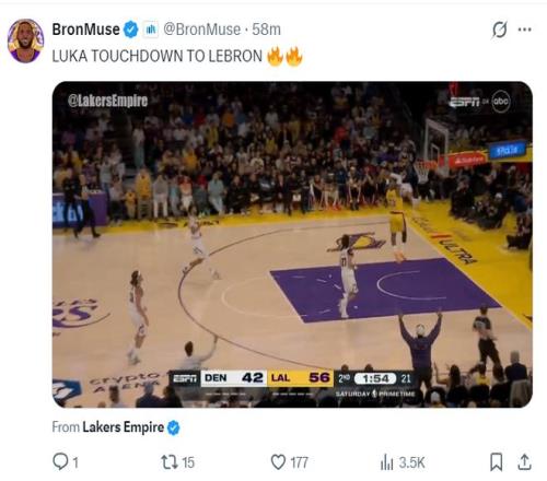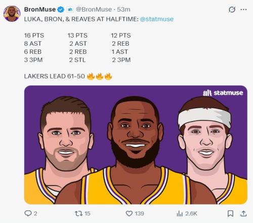 湖人三巨頭上半場的發揮都不錯,東契奇16分8助攻6籃板,詹姆斯13分2籃板2助攻2搶斷,里夫斯12分2籃板1助攻,湖人也一度領先17分。