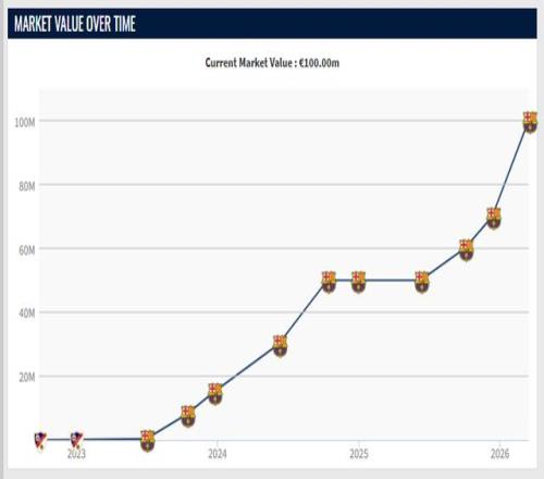 2023年初,費爾明的身價為10萬歐元;2023年夏天,費爾明進入巴薩一線隊,到10月份,完成巴薩首秀的費爾明,身價漲到800萬。在巴薩站穩腳跟之后,費爾明的身價不斷攀升,1500萬、3000萬、5000萬……去年10月,費爾明身價漲到6000萬,12月達到7000萬,最新一期飆升至1億!
