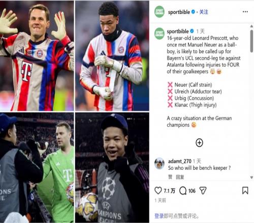 諾伊爾因小腿受傷而休戰,預計將在國際比賽日之后復出。他的替補烏爾比希上周在客戰亞特蘭大的比賽中遭受腦震蕩,被迫離場,隨后周六對陣勒沃庫森的比賽由烏爾賴希頂替出場。然而,烏爾賴希在那場比賽中大腿內收肌撕裂。此外,19歲的萊昂·克拉納奇也因大腿受傷無法出戰,因此普雷斯科特成為了教練組的首選,他將與19歲的揚尼斯·巴特爾(拜仁二隊門將)競爭出場機會。