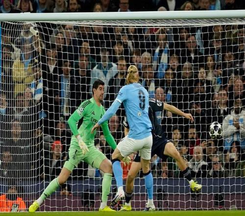 第23分鐘,羅德里大范圍轉(zhuǎn)移,多庫左路反越位前插下底橫敲,哈蘭德?lián)岦c捅射被庫爾圖瓦神勇?lián)涑觯S后皇馬立馬快速反擊,迪亞斯擺脫分球,維尼修斯又是一次一對一長途奔襲甩開防守后勁射稍稍高出了橫梁。第26分鐘,多庫左側(cè)肋部直塞,哈蘭德斜插跑位小角度低射,又是庫爾圖瓦神撲救主;1分鐘后,楚阿梅尼中圈斜線轉(zhuǎn)移,居萊爾組織反擊橫敲禁區(qū),維尼修斯點球點搶點鏟射險些再進一球。