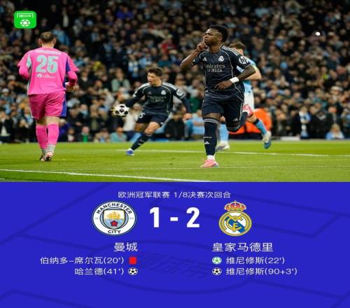 北京時間3月18日歐洲冠軍聯賽 1/8決賽次回合,曼城對陣皇家馬德里。上半場,B席獲紅點套餐后維尼修斯主罰命中,多庫助攻哈蘭德搶射破門;下半場,楚阿梅尼助攻維尼修斯上演梅開二度。最終比分曼城 1-2 皇馬。兩回合總比分曼城1-5皇馬。