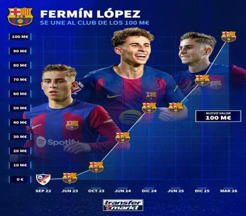 費爾明-洛佩斯在2022年9月的時候身價是5萬歐元。到了2023年10月,他的身價已經上漲到800萬歐元。在2023年12月,他的身價上漲到1500萬歐元。在2024年10月,他的身價上漲到5000萬歐元。在2025年12月,他的身價漲到7000萬歐元。而現在他的身價達到1億歐元。不到4年的時間,他的身價上漲幅度太驚人了!