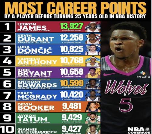 最近,愛德華茲成為NBA歷史第3年輕的10000分球員,這也讓他在“25歲前生涯總得分”這類榜單里的位置更直觀了。放到這張榜單里看,他已經沖進前十。再往前看,詹姆斯和杜蘭特還在前面,東契奇總分排第3,但場均得分已經沖到了榜單第一。比起只看總分高低,這份榜單更有意思的地方,其實是年輕階段的得分效率差距。
