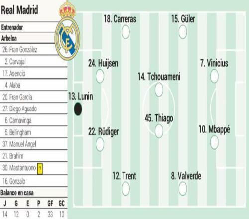 皇馬預(yù)計(jì)首發(fā)十一人: 盧寧 / 特倫特、呂迪格、懷森、卡雷拉斯 / 巴爾韋德、蒂亞戈、楚阿梅尼、居萊爾 / 姆巴佩、維尼修斯