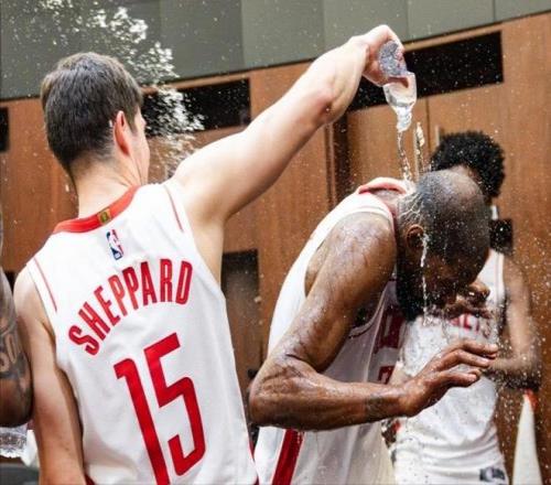 相比于打破紀錄,更重要的是賽后全隊在更衣室中朝杜蘭特潑水慶祝,氣氛非常棒打破了外界對于火箭隊內部不和的一些猜測與流言。