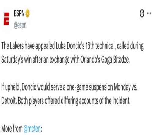 這是東契奇本賽季第16次技術(shù)犯規(guī)。如果這次技犯不予撤銷,按照規(guī)則,他將因?yàn)榧挤笣M16次,在下周二湖人對陣活塞的比賽中自動(dòng)禁賽一場。