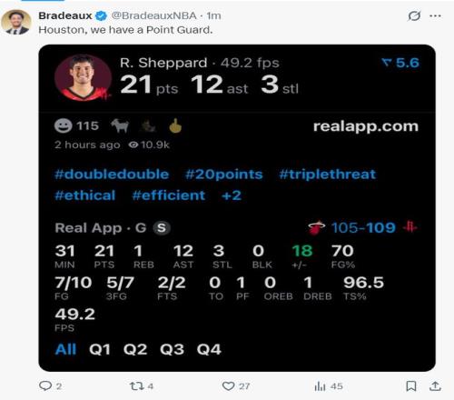 末節(jié)火箭一度落后到12分,小賈兩個三分,謝潑德一個三分,霍勒迪兩個三分火箭再度反超,謝潑德單防被米切爾吃了一個,謝潑德助攻KD三分命中,在熱火將分差縮小到1分后,又是謝潑德在終場前12.7秒拋投命中打停熱火,伊森致命失誤被熱火反超,