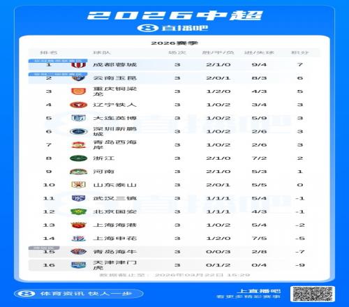 深陷泥潭!中超3輪后2隊0勝排榜末海牛3連敗7分天津1平2負9分 直播吧 2026-03-22 20:12:09 體育播報03月22日宣 2026賽季中超第3輪比賽全部完賽,3輪過后仍有國安、海港、申花等6隊負分,其中海牛和津門虎2隊仍0勝,排在積分榜末。3輪過后的負分球隊:武漢三鎮,1勝1平1負,-1分北京國安,1勝1平1負,-1分上海海港,1勝2負,-2分上海申花,1勝2平,-5分青島海牛,3負,-7分天津津門虎,1平2負,-9分足球免費觀看_中超免費觀看_中國足球免費觀看_足球高清在線_中超高清在線_中國足球高清在線 足球 中超 中國足球 天津津門虎 青島海牛 話題 上一篇: 刷新工體上座紀錄!國安主帥社媒:感謝最棒的球迷,我們共克難關 下一篇: 張玉寧:以最佳狀態重逢老友國足1月集訓夯實基礎