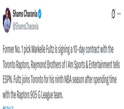 北京時間3月24日,據名記Shams報道,2017年NBA選秀狀元富爾茨將與猛龍簽一份10天短合同。