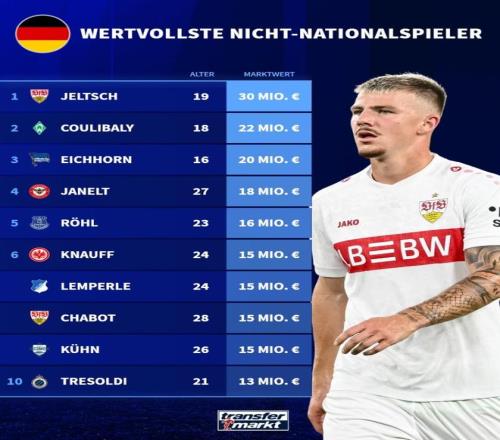 在德轉公布的身價榜單中,斯圖加特的19歲球員耶爾奇以3000萬歐元居首;不萊梅的庫利巴利以2200萬歐元位居第二;來自柏林赫塔的16歲小將艾希霍恩以2000萬歐元排名第三。