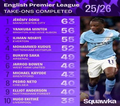 3月24報道 數據機構Squawka統計出了本賽季英超球員過人數情況,曼城邊鋒多庫以63次居首。