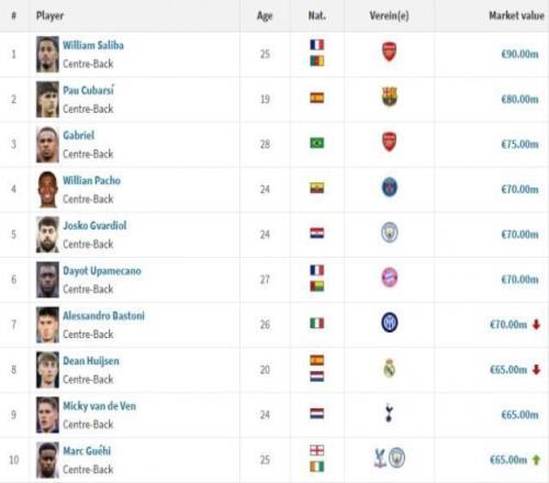 最新全球中后衛身價排名(單位:歐元)