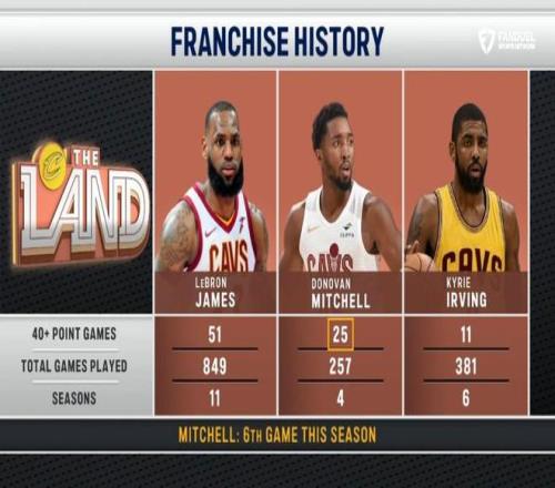 此役,米切爾還創下了兩大紀錄。第1、數據顯示,這是米切爾本賽季第6場40+,騎士生涯第25場,隊史第二,僅次于勒布朗詹姆斯的51場。