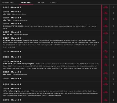 為何火箭隊說他們有可以滿足雄鹿的籌碼呢?除了有像申京、伊森這樣的出色年輕資產、杜蘭特這樣還在聯盟頂級水準的球星外,火箭隊未來6年里還有6個首輪簽7個次輪簽1個首輪互換權,雄鹿作為重建的球隊他們最需要的就是選秀權資產。