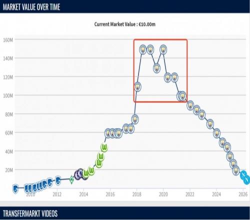 作為曼城的傳奇中場,德布勞內在26歲-30歲時,身價超過1億,最高達到過1.5億歐。他保持億元先生的身份將近4年,直到30歲后身價才漸漸下跌。在狀態和年齡的雙重影響下,34歲的“丁丁”身價已跌至1000萬歐。