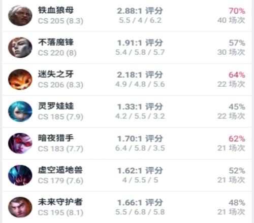 而Doran也是一直在鉆研VN上單,并且近期多次嘗試冰鳥上路,以下為Doran本賽季使用英雄前七位,VN使用場次拿到21場,勝率超過6成。