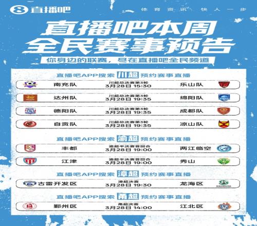 吧友們注意啦!本周體育播報全民頻道將為你帶來一系列精彩絕倫的賽事直播!把家門口的熱血賽事一網打盡!