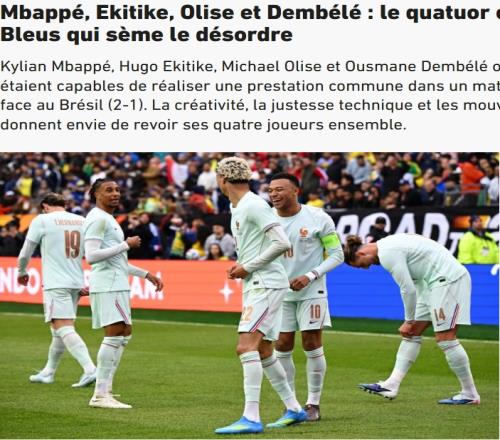 體育播報(bào)03月28日宣 法國(guó)隊(duì)在友誼賽中2-1擊敗巴西隊(duì),法媒《隊(duì)報(bào)》撰寫文章,分析了法國(guó)隊(duì)目前的前場(chǎng)四人組,即姆巴佩-埃基蒂克-奧利塞-登貝萊的組合,這四人創(chuàng)造力十足,并且優(yōu)勢(shì)互補(bǔ)。文章內(nèi)容如下: