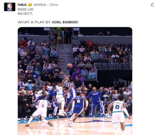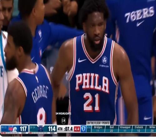 這場比賽黃蜂在主場一度領先15分,可在末節費城已經抹平了分差,進入最后8分鐘兩隊開始進入僵持階段,終場前31秒馬克西兩罰一中后費城已經領先3分,終場前19秒鮑爾三分不中,黃蜂前場籃板后,布蘭登-米勒在終場前7秒出手底角三分,恩比德從斜側里殺出完成制勝封蓋。