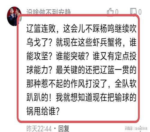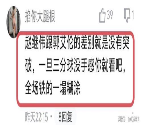 遼寧隊4大主力糟糕的表現,賽后也被球迷們紛紛吐槽。“遼寧一群人真像一群無頭蒼蠅?!?;“趙繼偉跟郭艾倫的差別就是沒有突破,一旦三分球沒手感你就看吧,全場鐵的一塌糊涂”;“三個后衛總共20中3,打毛線,一人一球”;“遼籃連敗,這會兒不踩楊鳴繼續吹烏戈了?就現在這些蝦兵蟹將,誰能攻堅?誰能突破?誰又有定點投球能力?最關鍵的還把遼籃一貫的那種惹不起的作風打沒了,全隊軟趴趴的!我就想知道現在把輸球的鍋甩給誰?”;“遼寧解散吧,可別丟人了,一盤散沙”……