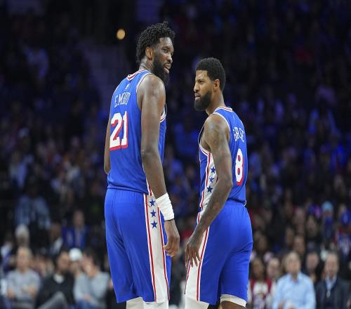 復出之后的兩場比賽,恩比德場均出戰32分鐘,得到32分6籃板4.5助攻1.5蓋帽,投籃命中率55.6%,三分命中率66.7%,罰球命中率81.8%。喬治自禁賽歸來的兩場比賽,場均砍下27分9.5籃板3助攻4搶斷,投籃命中率48.7%,三分命中率41.6%(24中10)。